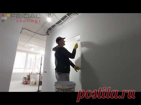 Человек в рабочей одежде что-то делает на стене в помещении с белыми стенами. Он носит кепку и перчатки, рядом стоит ведро. Он кажется занятым рукавной работой, возможно, занимается окраской или штукатуркой стены.