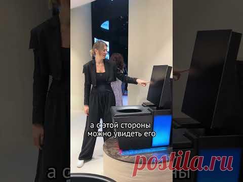 На фотографии изображена выставочная зона с женщиной, которая смотрит на экраны. На переднем плане видим часть другого экрана с надписью на русском языке: "а с этой стороны можно увидеть его". Окружение кажется современным и стилизованным под технологическую выставку или презентацию.