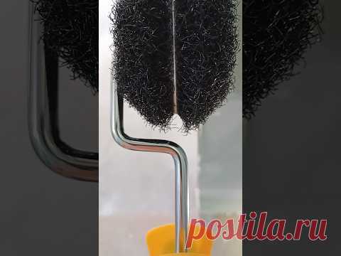На изображении представлены щетки для чистки бутылок, которые вставлены в стеклянную емкость. В нижней части емкости видна желтая губка.