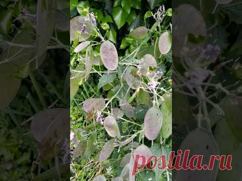 На изображении видны семена растения луносеменник (Lunaria annua), которые известны своими прозрачными, круглыми и плоскими створками-семянками, напоминающими монеты. Растение окружено зелёной листвой.