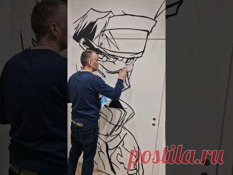 На изображении мужчина о чем-то размышляет или занимается рисованием на большом полотне, на котором изображен стилизованный персонаж в шляпе. Все происходит в помещении с искусственным освещением.