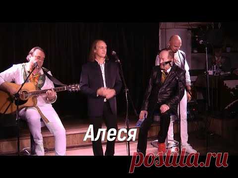 На сцене выступает музыкальная группа. Один человек играет на гитаре, другой поет в микрофон, еще двое стоят позади. На переднем плане виднеется слово "Алеся" и веб-адрес.