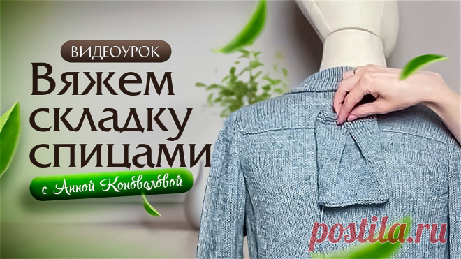 Изображение демонстрирует часть вязаной одежды на модели, и текст "Вяжем складку спицами с Еленой Кожухарь" на русском языке, что указывает на обучающий материал или видеоурок по вязанию. На заднем фоне изображены зеленые листья, возможно, для придания естественности и уюта сцене.
