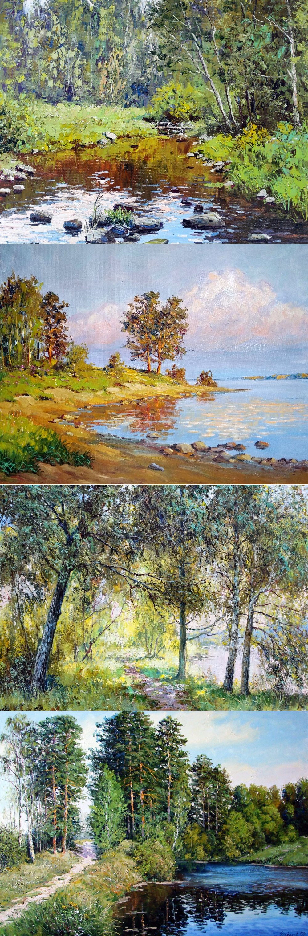 Коллаж из четырех живописных пейзажных картин, изображающих природные сцены с реками, деревьями и отражением в воде.