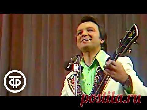 На изображении мужчина со смеющимся лицом играет на гитаре. Он одет в вышитую рубашку и пиджак. Фон за ним представляет собой коричневую занавеску. Изображение имеет признаки старой видеозаписи и надпись "positiva.ru" в нижней части.