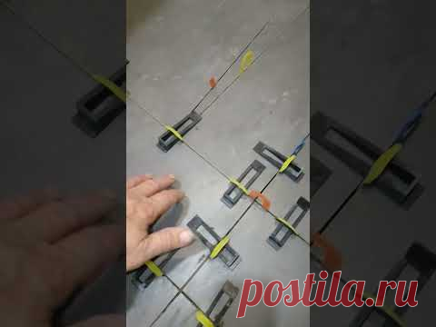 На изображении видна рука человека, укладывающего керамическую плитку на пол с использованием системы выравнивания плиток. Плиточные клинья и зажимы используются для обеспечения ровности швов и плоскости поверхности.
