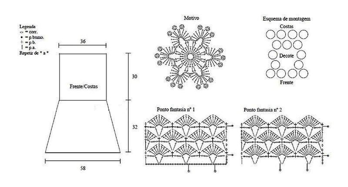 Изображение схемы для вязания: представлены выкройки, узоры вязания и схемы расположения элементов для создания одежды. Текст на картинке не на русском языке, возможно португальский.