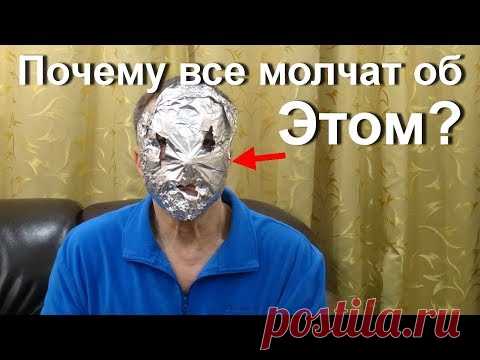 Человек с лицом, покрытым фольгой, сидит перед золотым фоном с надписью на русском языке: "Почему все молчат об этом?"