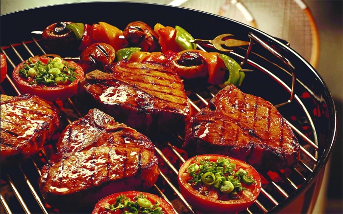 На изображении показано мясо и овощи, которые готовятся на гриле. Видны стейки с характерными полосами от грилля, помидоры, перец, и лук, приготовленные на открытом огне.