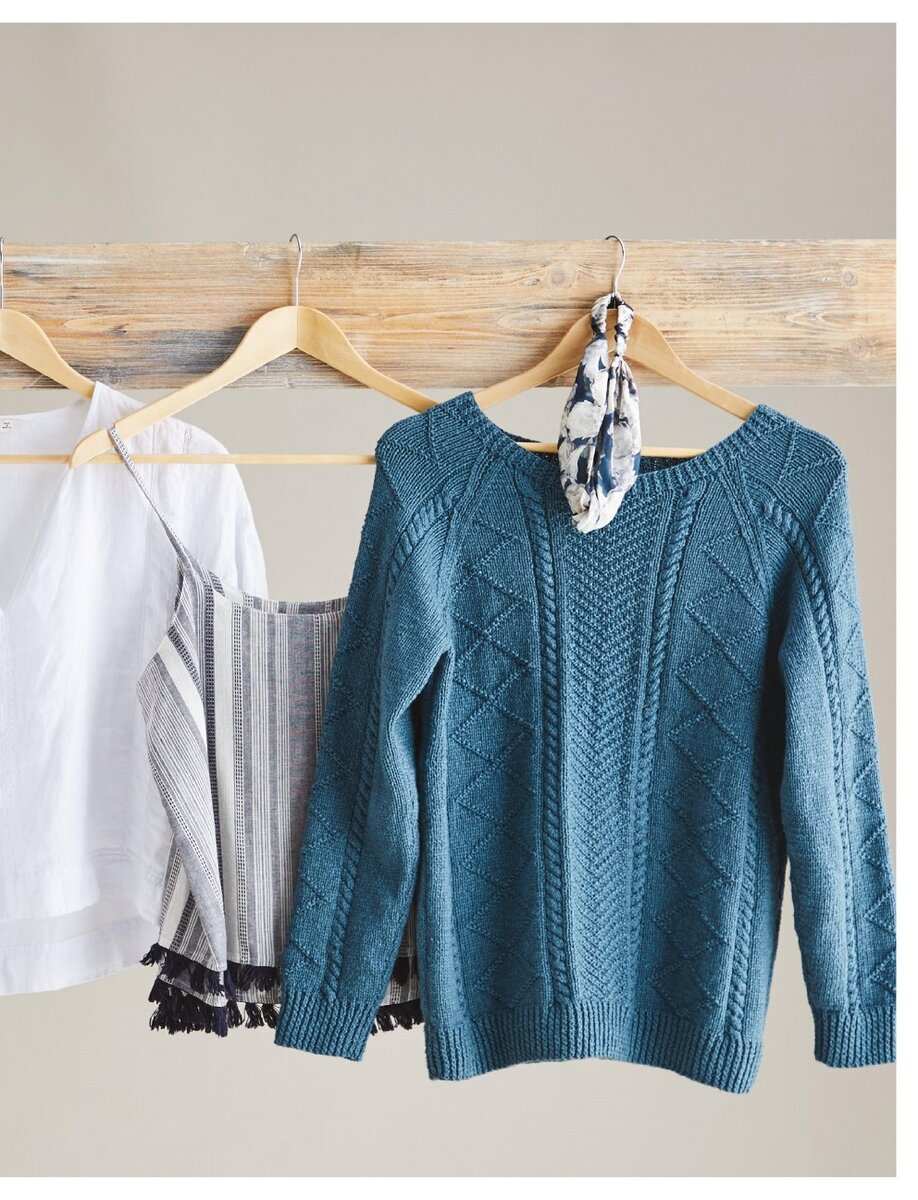На вешалке висят три предмета одежды: справа синий вязаный свитер с узором, посередине - белый блузон с украшением на воротнике, слева - полосатый предмет одежды с черной каймой. Все вешалки одинаковые, из светлого дерева.