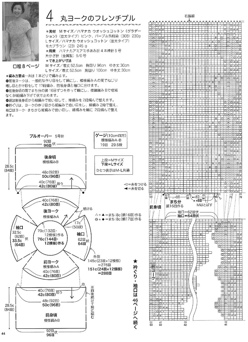 Изображение показывает страницу из журнала по вязанию или шитью с инструкциями и схемами для создания одежды. На странице присутствует фотография женщины, ношение примера одежды, диаграммы с размерами и выкройка. Текст и инструкции написаны на японском языке.