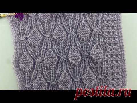 На изображении представлен фрагмент вязаного изделия, выполненный в технике кружевного вязания. Видно узор в виде повторяющихся мотивов, напоминающих соты или маленькие арки. Цвет пряжи - светло-фиолетовый.