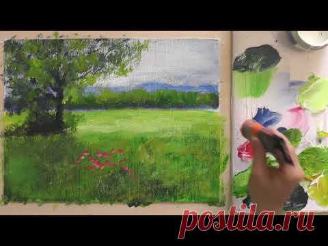 На изображении представлен процесс рисования пейзажа. Холст на столе показывает сельскую сцену с деревом, зеленым полем, кустами и голубым небом с облаками. Справа находятся несколько баночек с красками и палитра с различными оттенками зеленого и голубого. Рука художника с кистью попадает в кадр в нижней правой части изображения.