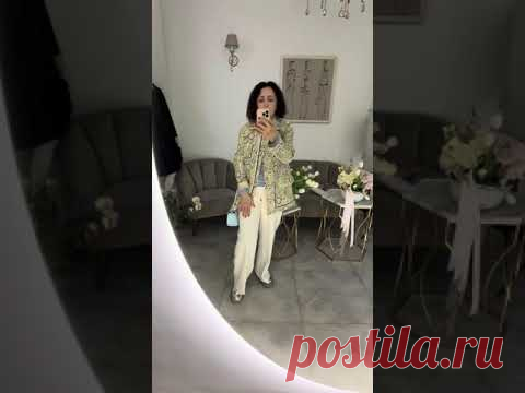 Женщина в светлом наряде делает селфи в зеркало в уютной комнате с интерьером в светлых тонах. На заднем плане видны стол и стулья, а также различные элементы декора.