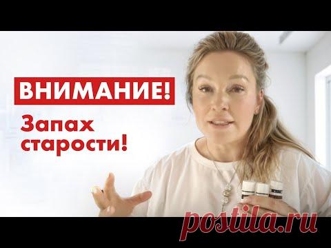 На изображении представлена женщина, держащая в руке косметические продукты, вероятно, кремы или научную рекламу. В верхней части изображения красным фоном и белым шрифтом написана фраза "ВНИМАНИЕ! Запах старости!", что предполагает научно-образовательный или рекламный контекст, связанный со старением или антивозрастными продуктами.