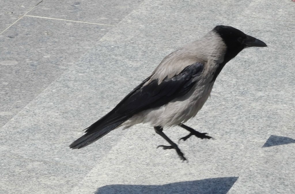 Птица, похожая на грача, стоит на тротуарной плитке.