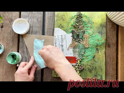 На изображении видно руки человека, проводящего крафт-работу. Человек прикладывает ткань к склеенным листам бумаги с изображением дерева на зеленом фоне. Возле расположены краски, щетка и контейнер с водой.