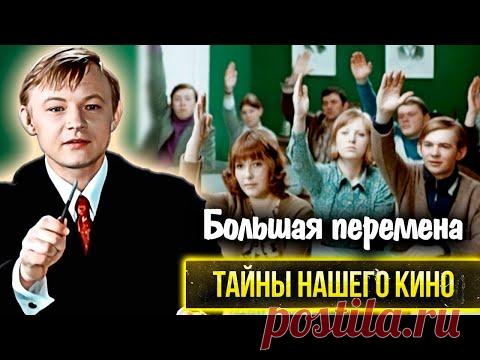 Коллаж изображений с мужчиной на переднем плане и группой людей, поднимающих руки на фоне, с текстом на русском языке, который гласит "Большая перемена" и "ТАЙНЫ НАШЕГО КИНО" с веб-сайтом внизу.