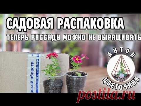 Изображение с текстом на русском языке, который гласит "САДОВАЯ РАСПАКОВКА Теперь рассаду можно не выращивать". На фото показаны два пластиковых стакана с растениями и пакет субстрата для растений. Внизу есть логотип и название "Антон цветочник" и веб-сайт "posadka.ru".