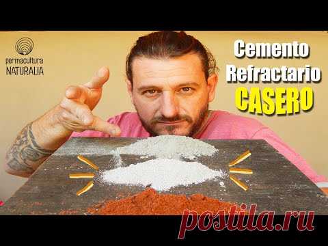 На изображении мужчина показывает жестом руки на стол с ингредиентами, похоже, для приготовления домашнего огнеупорного цемента. Надписи на изображении гласят "Cemento Refractario CASERO" и имеются ссылки на "permacultura NATURALIA" и "postila.ru". Мужчина имеет татуировки и усы, а его выражение лица предполагает наставление или демонстрацию.