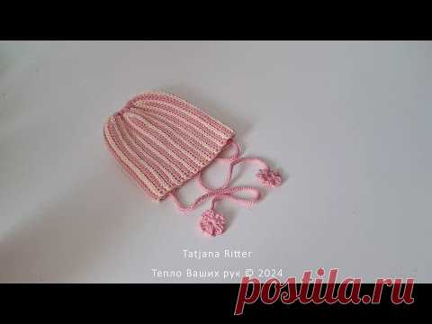 На изображении розовая вязаная детская шапочка с завязками, на которых находятся помпоны. Шапочка размещена на светлой поверхности.