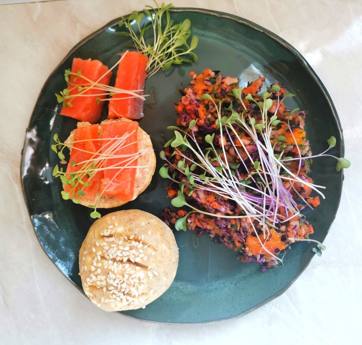 На тарелке представлено блюдо, состоящее из двух половинок булочки с кунжутом, ломтиков красной рыбы, салата из овощей и ростков. Блюдо выглядит как современная здоровая еда, предназначенная для ланча или ужина.