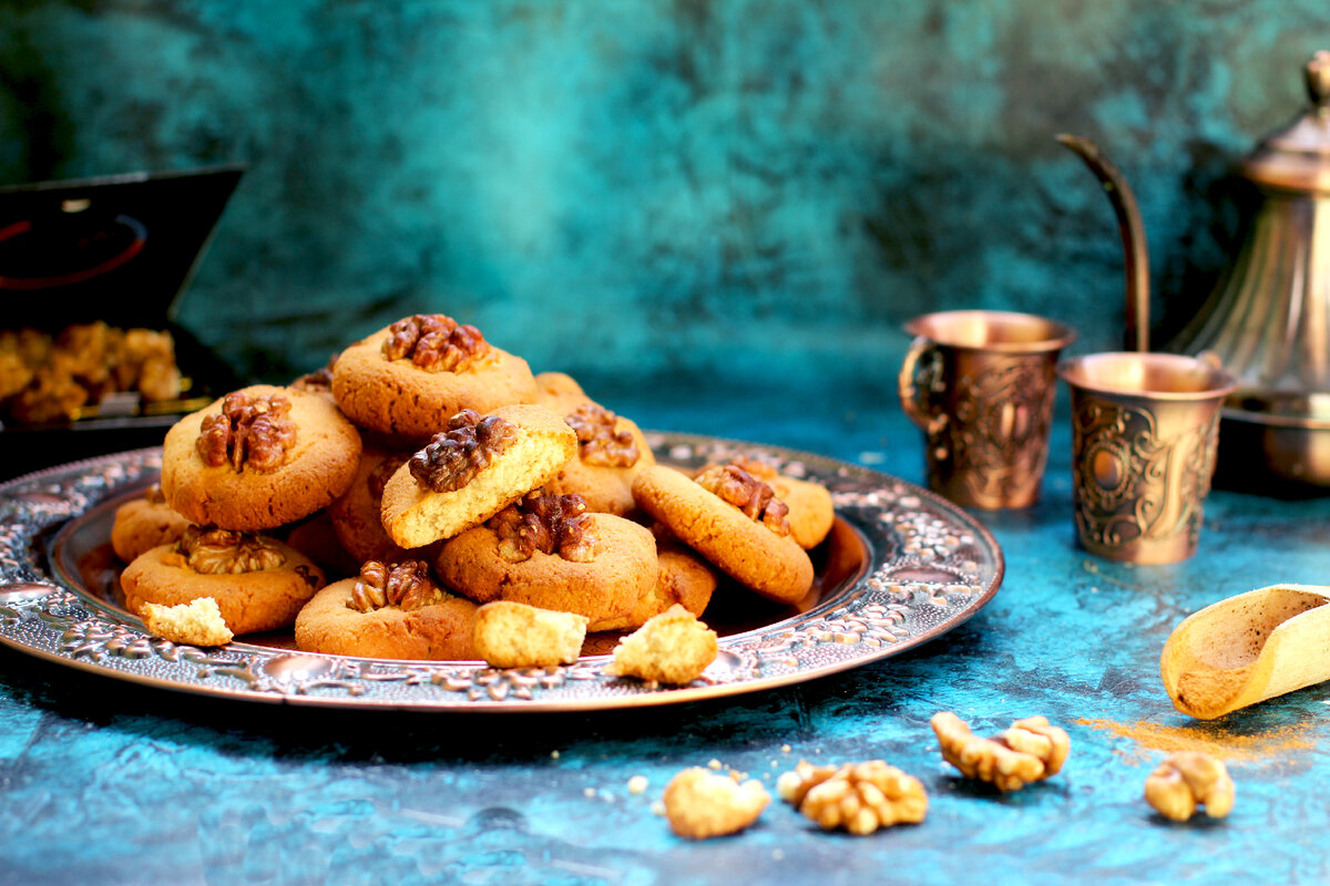 На изображении представлены печенья, украшенные цельными орехами, поданы на декоративной тарелке. В фоне видны металлические чашки и кувшин, возможно, для чая или кофе. Композиция находится на столешнице с характерным сине-зеленым фоном, создающим уютную атмосферу.