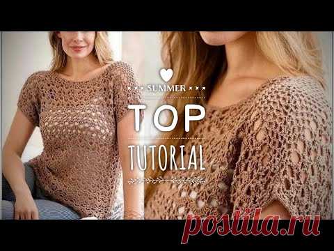 На изображении представлена женщина в вязаном топе бежевого цвета. Виден верхняя часть её тела и лицо улыбающейся женщины. На изображении также есть текст: "SUMMER TOP TUTORIAL" и веб-сайт "positiva.ru".