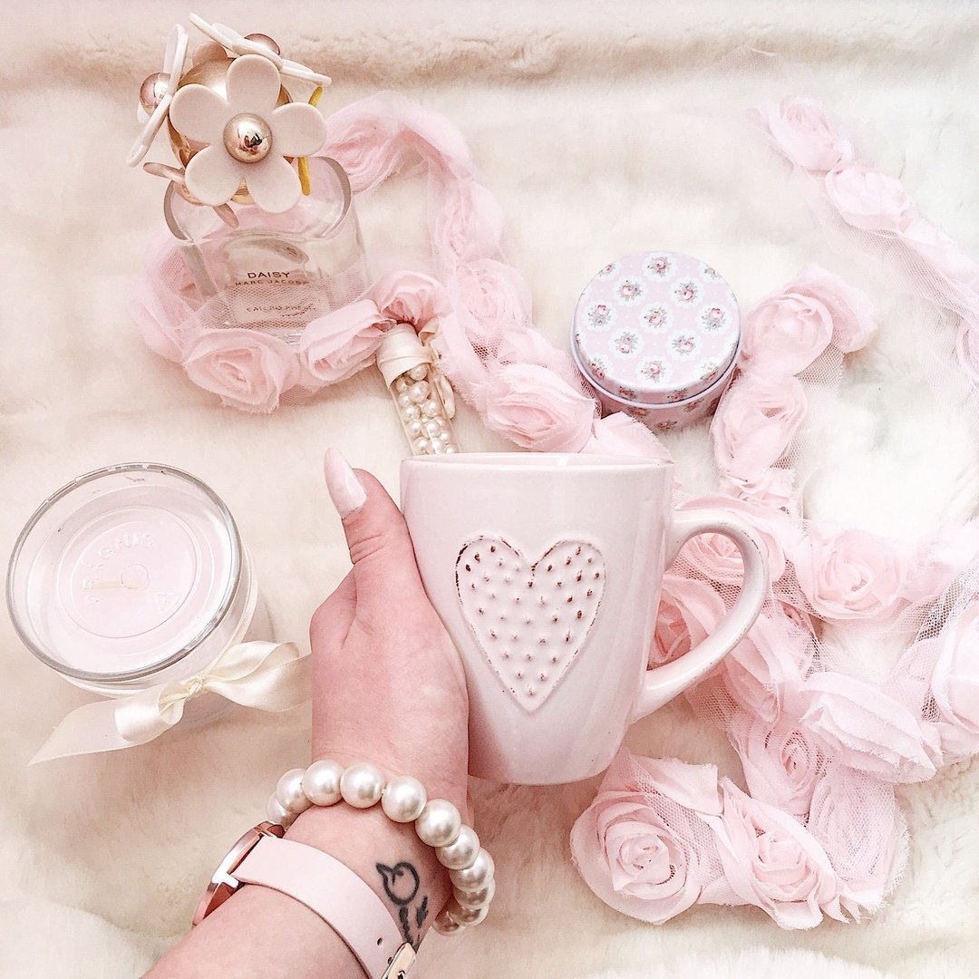 На изображении рука человека с браслетом из жемчуга держит кружку с рельефным сердечком. Вокруг расположены предметы розового цвета: парфюмерный флакон, тканевые розы и украшенная лента. Всё это расположено на мягкой поверхности, вероятно, пледе.
