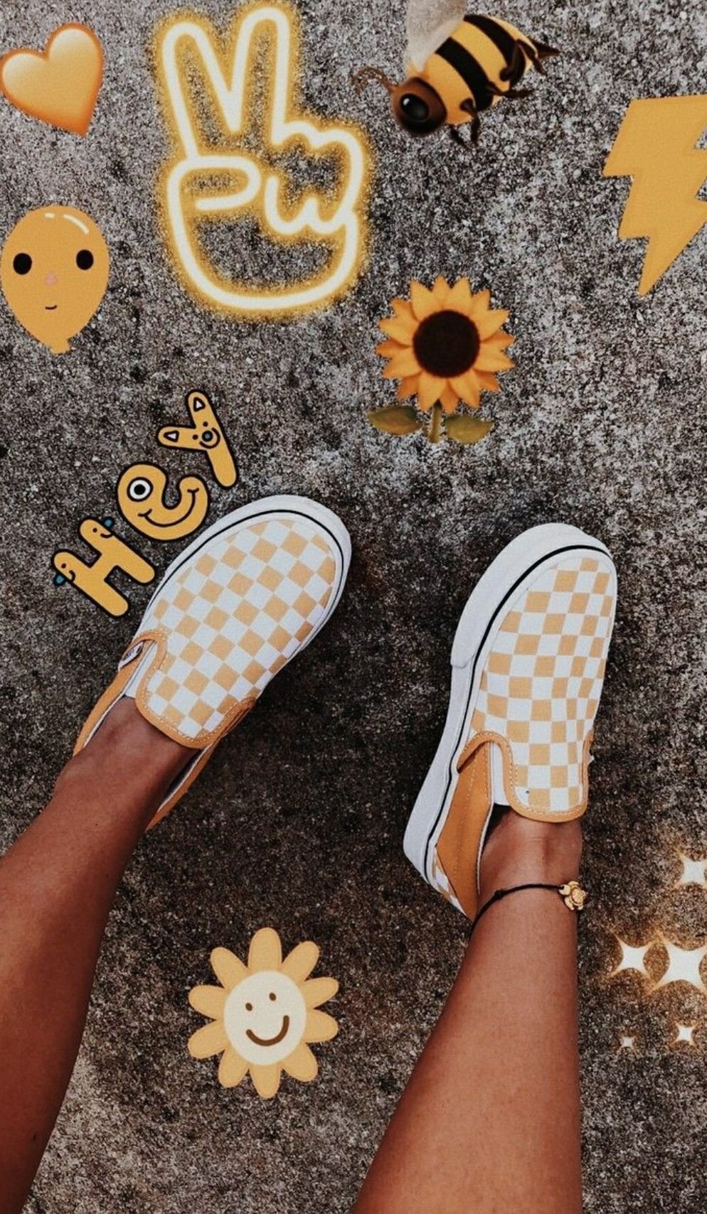 На изображении ноги человека, одетого в клетчатые кеды, стоящие на асфальте. Вокруг разбросаны различные стикеры и рисунки, такие как смайлики, пчела, солнцецветок и символ мира.