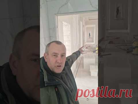 Мужчина делает селфи в помещении с белыми стенами. Он указывает рукой на фон, где видна длинная комната или коридор