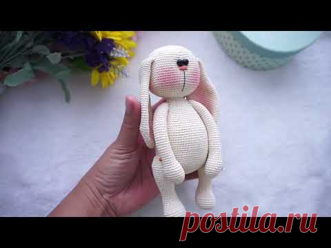 На фотографии изображена рука человека, держащая мягкую игрушку в виде белого зайца. Игрушка выглядит вязаной, и находится на фоне светлой поверхности, рядом видны цветы и элемент интерьера, похожий на чашку или вазу.