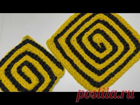 Вязаные квадраты с черно-желтыми спиральными узорами на белом фоне.