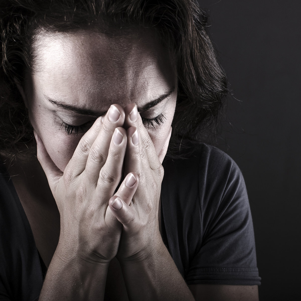 Женщина с закрытыми глазами, кажущаяся обеспокоенной или грустной, держит руки у лица.