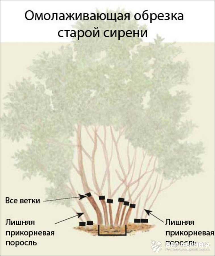 Изображение демонстрирует омолаживающую обрезку старой сирени. На рисунке показан куст сирени с выделенными обрезанными ветками и обозначенной молодой прикорневой порослью.