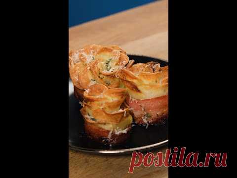 На изображении представлено блюдо, которое выглядит как запеченные картофельные розетки с беконом. Еда сервирована на темной тарелке, которая стоит на деревянной поверхности.