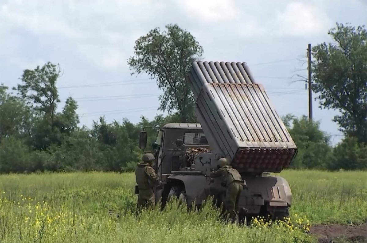 Военный грузовик с многствольной ракетной системой залпового огня (БМ-21 «Град») на полевой местности. На заднем плане видны деревья и облака.