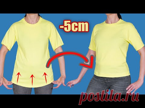 Изображение демонстрирует разницу в размере одежды после уменьшения, вероятно, на 5 см. Две фигуры, изображающие одного и того же человека: слева футболка висит свободно, справа она более облегающая. Под изображениями стрелки указывают на изменение размера футболки. На картинке есть текст, указывающий на уменьшение размера на -5 см и веб-сайт postila.ru.