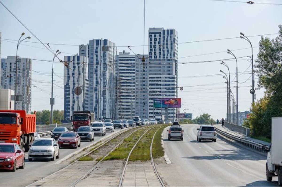 Дорога с движущимися автомобилями в городской среде. На заднем плане видны многоэтажные жилые здания и уличное освещение.