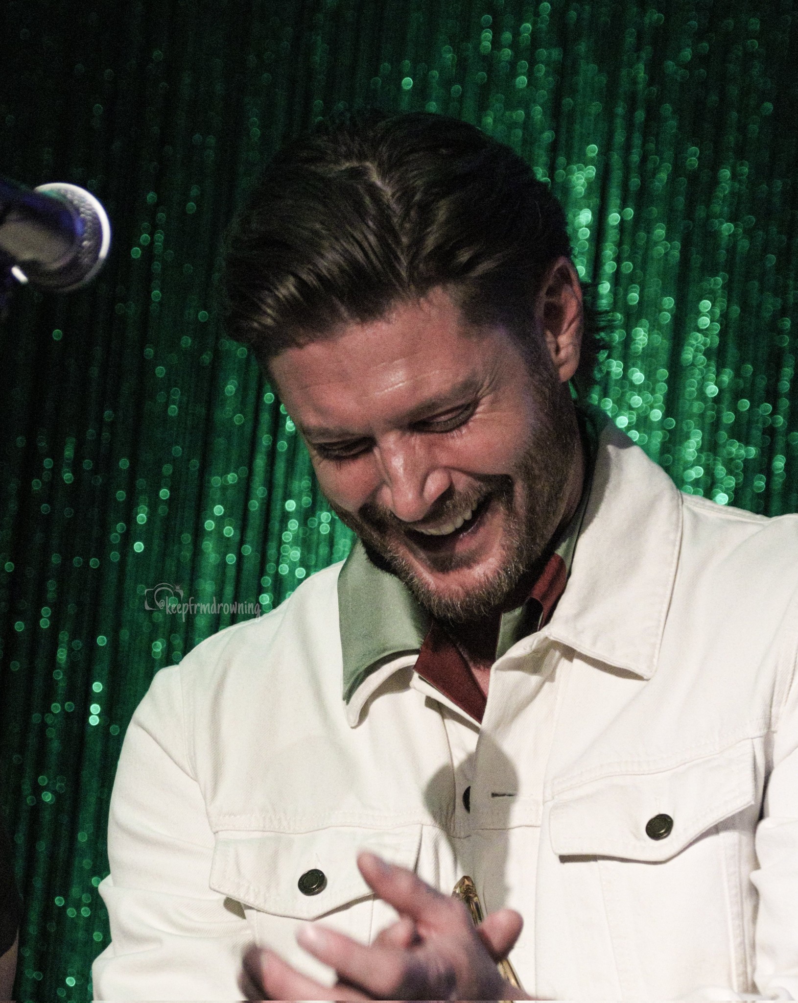 На фотографии изображен мужчина, вероятно музыкант, который улыбается и склонил голову вниз, стоя на сцене перед микрофоном с зеленым блестящим фоном позади него.