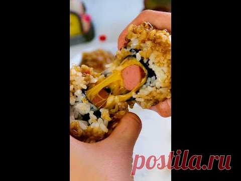 На изображении блюдо, похожее на суши с необычной начинкой, в которую входят рис, сосиска и, возможно, другие ингредиенты, такие как огурец или маринованный имбирь. Представленная кулинарная идея отличается от традиционных японских суши.
