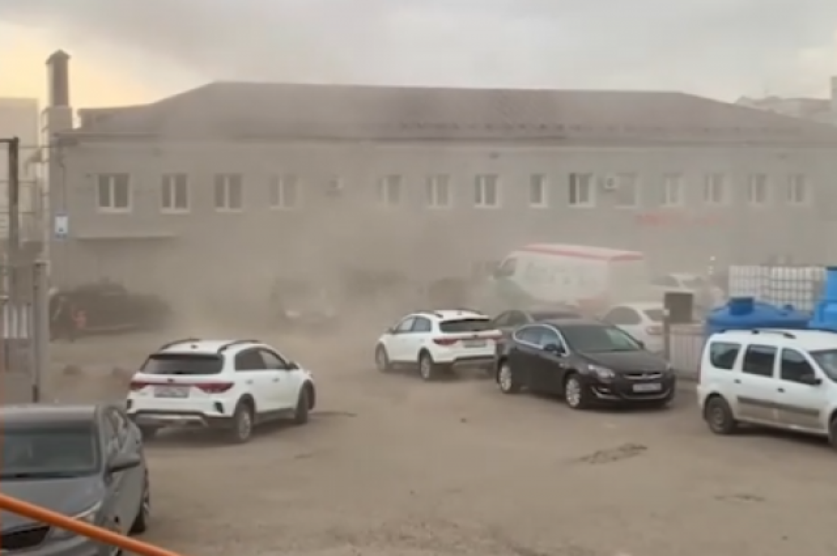 На фотографии изображена припаркованная машина возле большого здания во время пыльного ветра или бури, видно поднятые вверх пыль и мусор. Наблюдается плохая видимость, и в целом обстановка кажется хаотичной и пыльной.