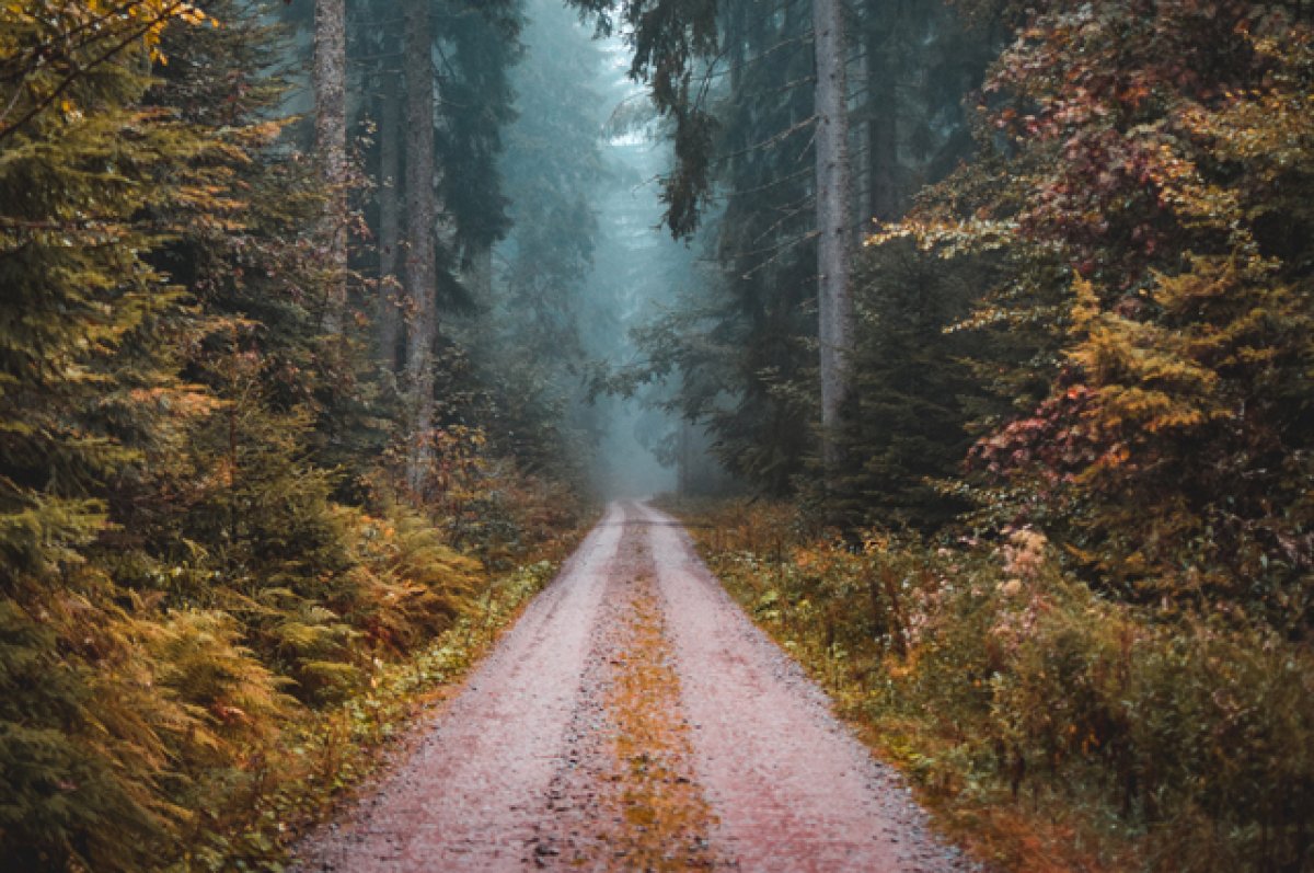 Тропинка в лесу покрытая листвой и окруженная деревьями с осенней листвой, туманный день создает мистическую атмосферу.