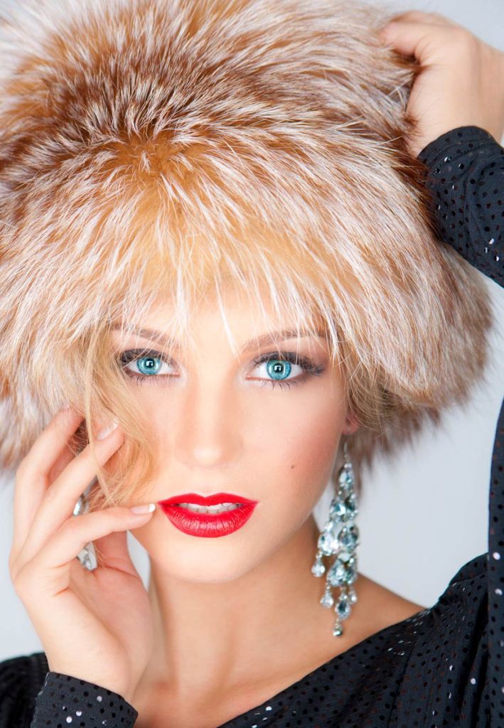 На изображении женщина с ярким макияжем, которая носит шапку из меха. У нее красные губы, зеленые глаза и она носит длинные серьги.
