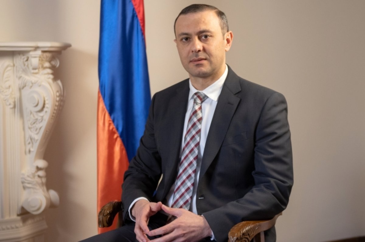 Мужчина в костюме и галстуке сидит на стуле перед флагом Армении. На заднем плане видны часть белой колонны и декоративная решетка.