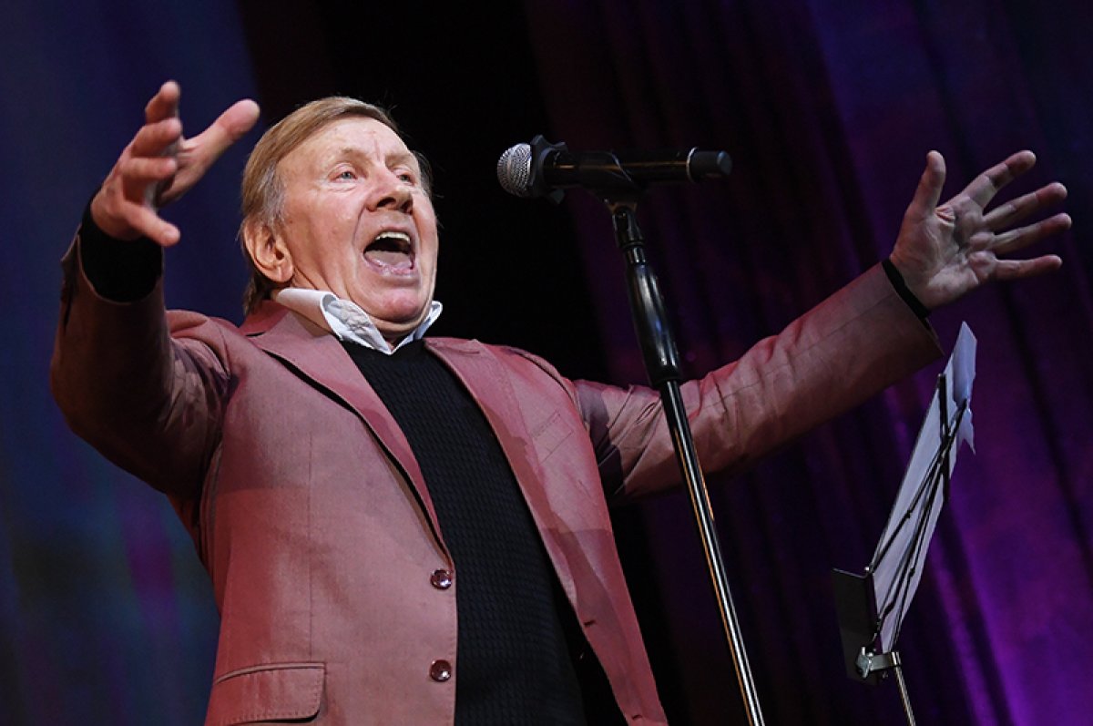 Человек с микрофоном, стоит на сцене и поет или говорит, разводя руками. На нем надет пиджак и белая рубашка, на заднем фоне фиолетовый свет.