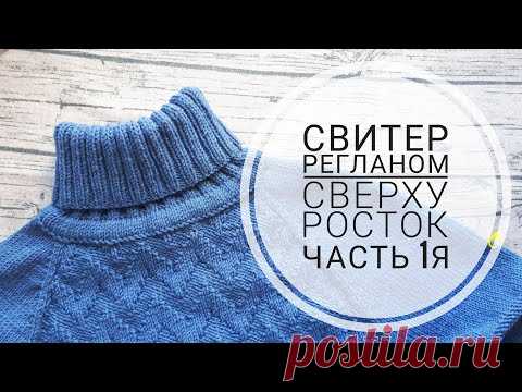 Изображение синего свитера с вязаным узором и воротником-гольф на фоне деревянной поверхности. На свитере есть текст на русском языке, который гласит: "СВИТЕР РЕГЛАНОМ СВЕРХУ РОСТОК ЧАСТЬ 1Я".