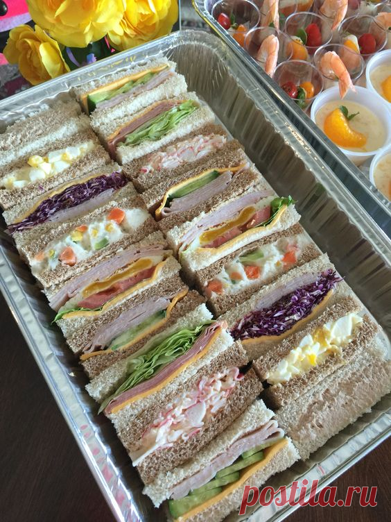 На изображении представлен поднос с ассорти бутербродов, нарезанных на порции. Бутерброды выполнены из разных видов хлеба и наполнены различными начинками, включая листья салата, мясные продукты, овощи и яйца.