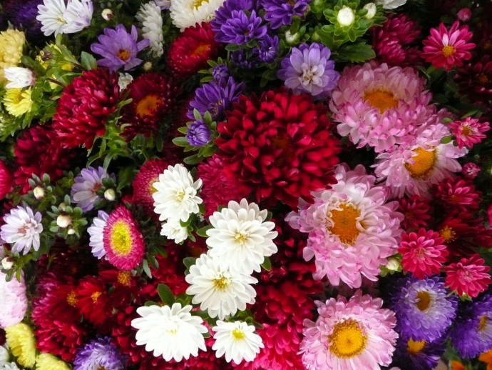 Разноцветные цветы, вид сверху. На изображении множество цветов различных оттенков и размеров, создающих красочный цветочный фон.