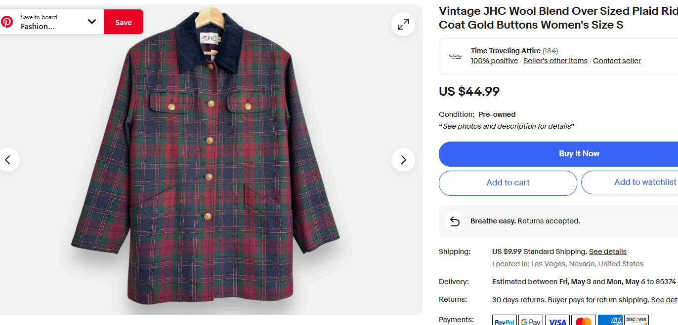 Vintage JHC Wool Blend Over Sized Plaid Riding Coat Gold Buttons Women's Size S | eBay